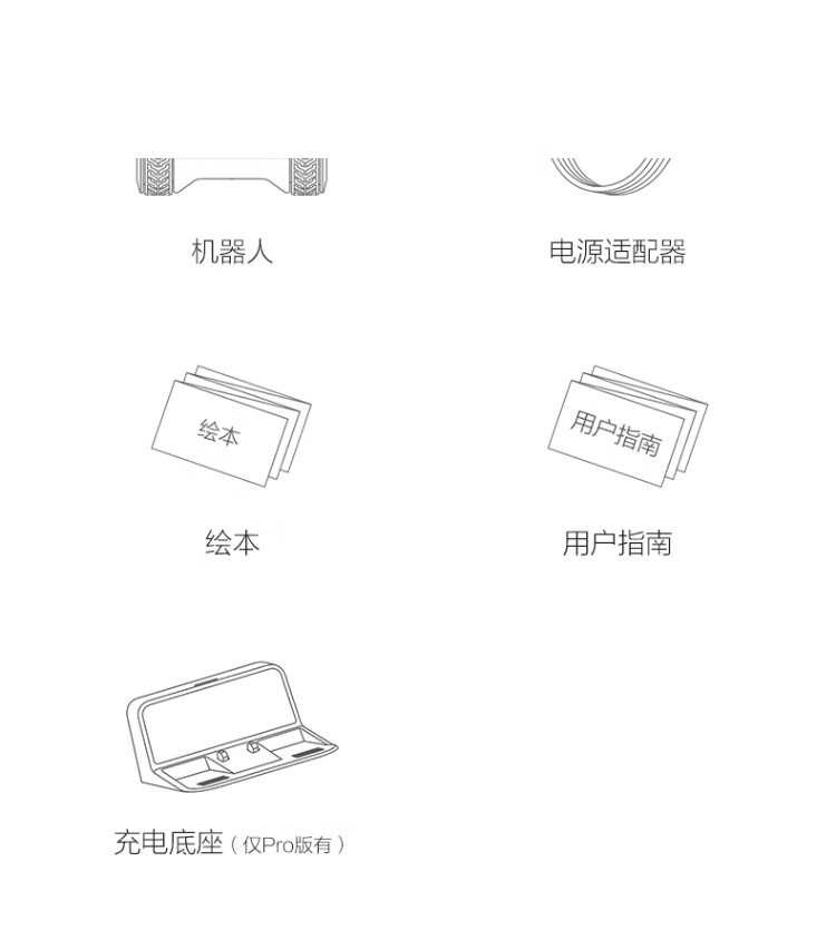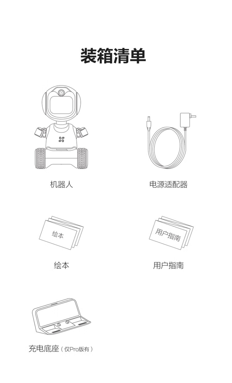 • 包装清单:机器人*1、电源适配器*1,绘本*1、用户指南*1、充电底座*1