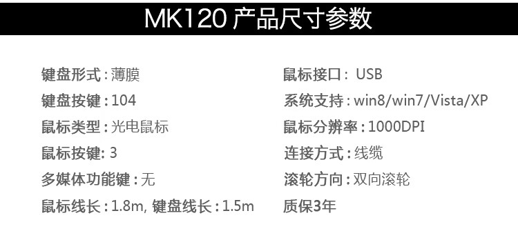 商品名称:罗技(Logitech) MK120 键鼠套装 有线键鼠套装 办公键鼠套装 全尺寸104键 黑色