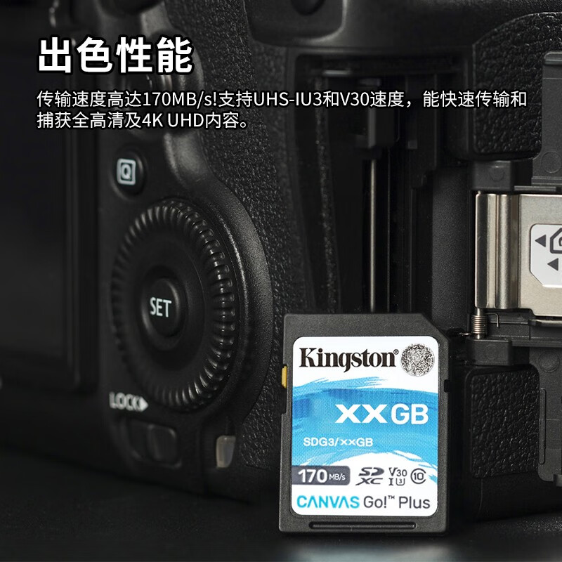 商品名称:金士顿(Kingston)SD内存卡 高速相机存储卡 单反微单专用sd存储卡V30 U3 class10 SDG3/128G【读速170M/S 丨4K超清】